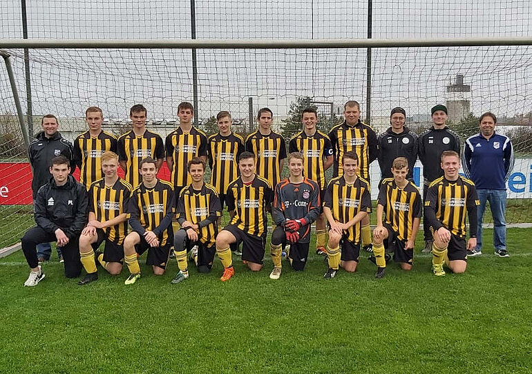 Stehend von links: Wolfgang Grad (Trainer), Luis Riehl, Andreas Gerner, Jonas Keller, Felix Herzog, Jonathan Zeise, Lorenz Herzog, Georg Klein, Simon Hirschmann (Betreuer FCM), David Hofbeck (Betreuer DJK/SpVgg, Torwarttrainer), Gerd Buchner (Betreuer TSV)
