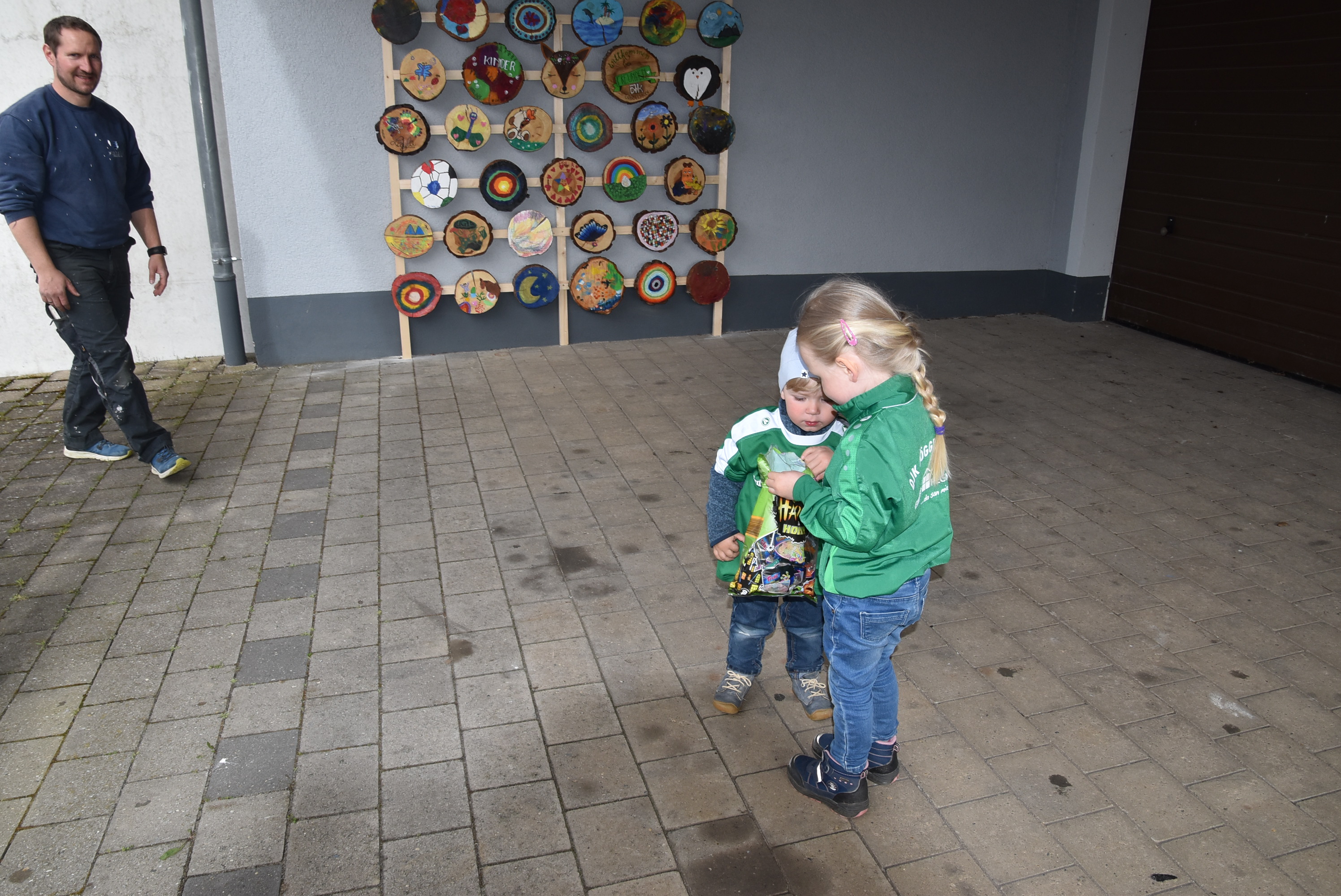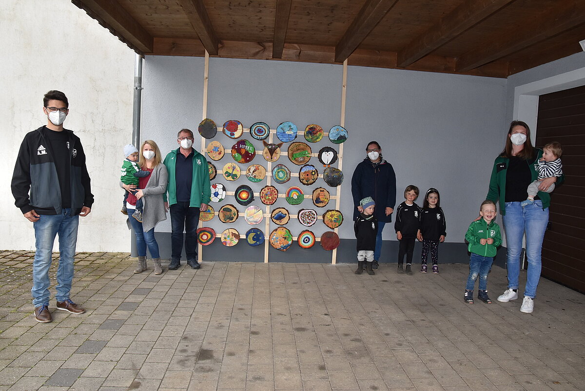 Inzwischen wurde von Andreas Muschaweck extra eine Vorrichtung zum Anbringen der bemalten Scheiben am DJK-Sportgelände erstellt. Die 36 Kunstwerke wurden dort angebracht und können nun bewundert werden. Auch die noch fehlenden Baumscheiben sollen sobald sie abgegeben werden dort noch Platz finden, so wurde bei der offiziellen Übergabe festgehalten, bei der Vorsitzender Walter Fleischmann die Initiative lobend hervorhob. Er freute sich über den Erfolg der Aktion und den idealen Platz für die künstlerischen Werke der Kinder am Vereinsdomizil.