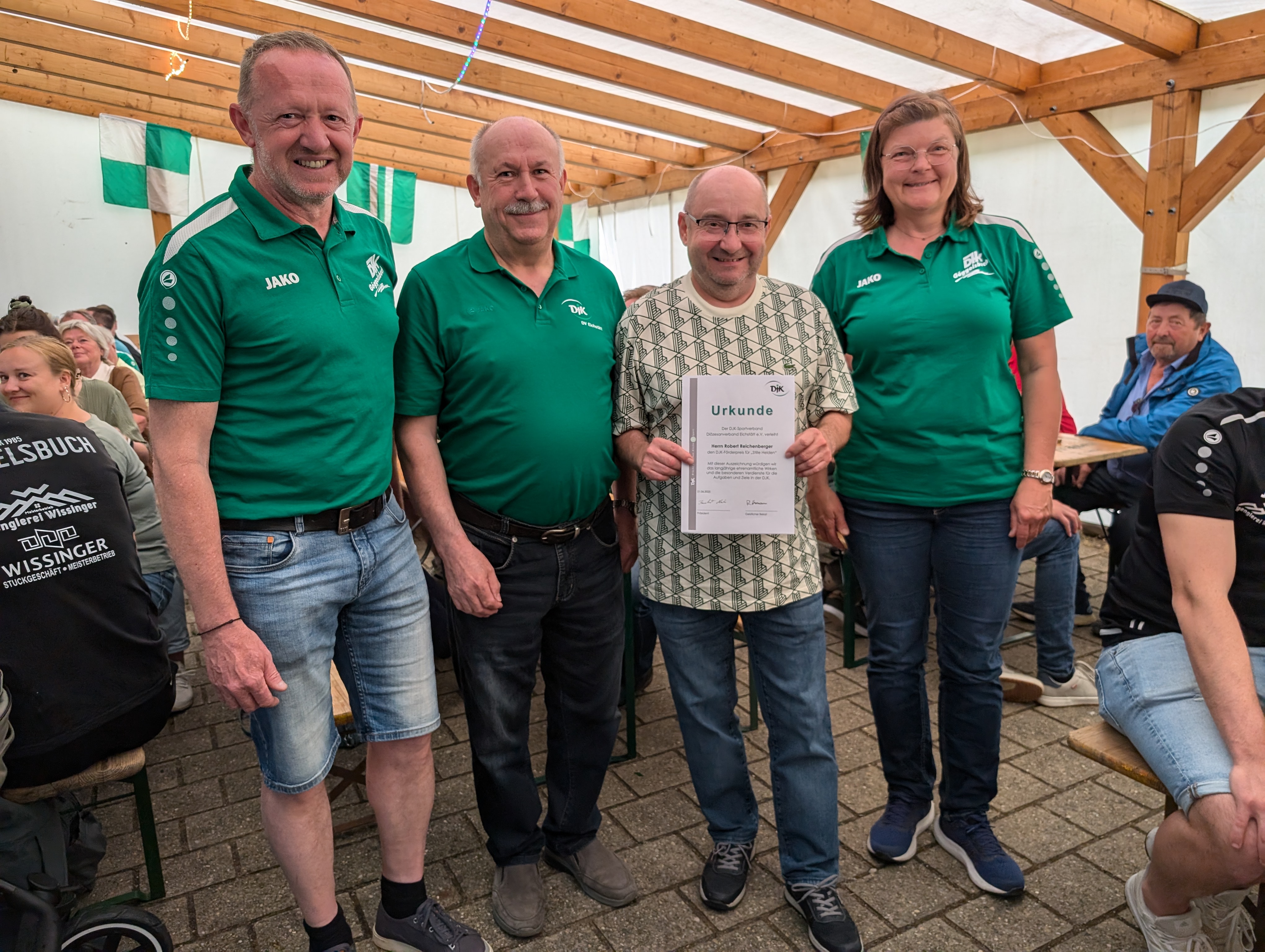 Er ist kein Mann der großen Worte, doch sein Wirken spricht Bände. Robert „Robi“ Reichenberger wurde von der DJK Göggelsbuch für sein langjähriges und vielseitiges Engagement im Verein gewürdigt. Die Ehrung übernahm Franz Kerschensteiner der stellvertretende Kreisvorsitzende Mitte des Diözesanverbands Eichstätt. Seit inzwischen 35 Jahren engagiert sich Robert in unterschiedlichsten Bereichen für die DJK, zuverlässig und bescheiden. Besonders die Nachwuchsarbeit liegt ihm am Herzen. 21Jahre lang war er als Trainer und Betreuer der Jugendmannschaften aktiv und vermittelte jungen Fußballerinnen und Fußballern nicht nur Technik und Taktik, sondern auch Teamgeist und Fairness. Von 2005 bis 2010 übernahm er darüber hinaus die Aufgabe des Gesamtjugendleiters Fußball und trieb in dieser Zeit die Entwicklung der Jugendarbeit maßgeblich voran. Parallel dazu verwaltete er über 15 Jahre lang das Passwesen des Vereins, eine verantwortungsvolle Aufgabe, die er mit höchster Sorgfalt erfüllte. Auch im digitalen Bereich setzte Robert wichtige Impulse. Er erstellte neben der ersten Webseite des Vereins eine eigenständige DJK-Junioren Seite mit dem ersten Ergebnisdienst des BFV für eine Gruppe. Bei der Neugestaltung der Vereins-Homepage war er 2007, 2013 und 2019 maßgeblich beteiligt und betreut sie seither. Dank seines Engagements ist der Internetauftritt der DJK stets aktuell und informativ. Seit 2012 gehört er zudem dem DJK-Team „Neue Medien“ an und sorgt dafür, dass der Verein auch online professionell vertreten ist. Ein weiteres Steckenpferd ist die Presse- und Öffentlichkeitsarbeit. Robert verfasst regelmäßig die wöchentlichen Spielberichte der 1. Mannschaft und übernahm 2023 die allgemeine Pressearbeit für das gesamte Dorf und alle dort aktiven Vereine, ein Engagement, das weit über den Sport hinausreicht.