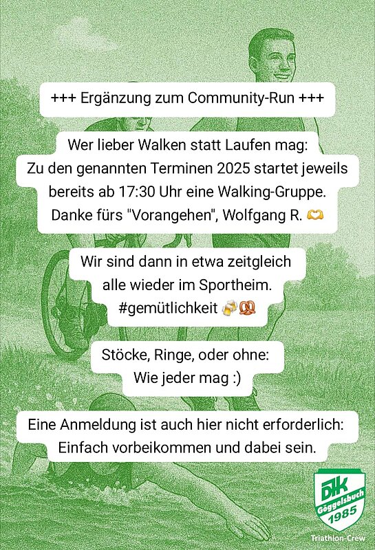 Wer lieber walken statt laufen möchte, kann jeweils bereits ab 17:30 Uhr mit unserer Walking-Gruppe starten.