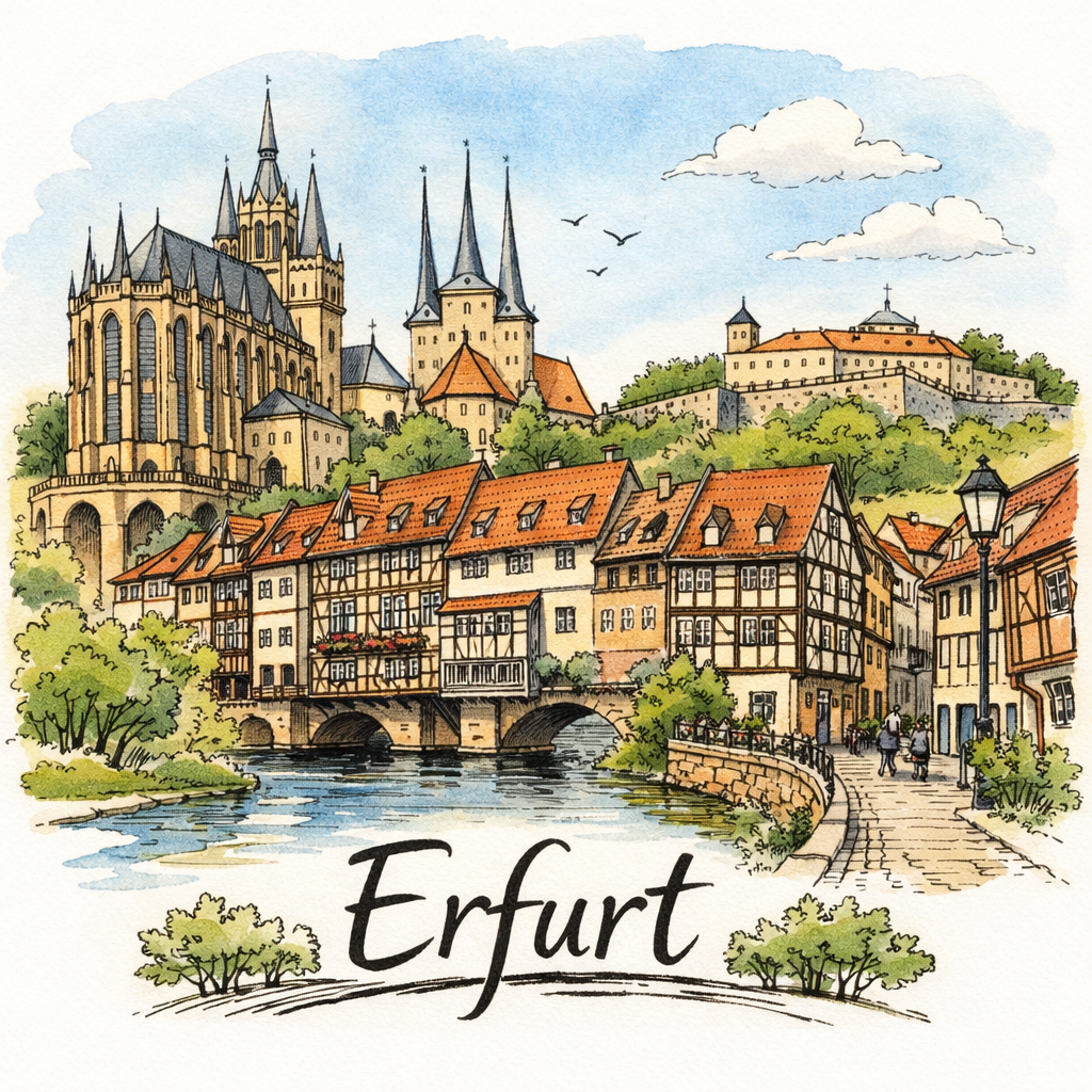 Am Domplatz prägt der Erfurter Dom das eindrucksvolle Stadtbild und erinnert an die lange kirchliche Tradition. Nur wenige Schritte weiter zeigt die Krämerbrücke die wirtschaftliche Bedeutung Erfurts im Mittelalter.