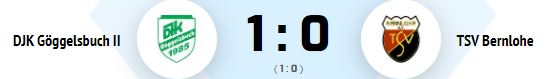 Den besseren Start hatte die DJK Göggelsbuch. Nach 16 Minuten prüfte Bastian Kraußer den Bernloher Torwart Thomas Winkler. Göggelsbuch bestimmte das Spiel, doch konnten sie sich keine klaren Torchancen erarbeiten. Als in der 32. Minute Kraußer mit einem Diagonalpass auf Markus Goll legte, nahm dieser den Ball gekonnt mit und schob zum 1:0 ein. In der zweiten Hälfte hatte Göggelsbuch zwar wieder mehr vom Spiel, jedoch auch Glück, dass der eingewechselte Yavuz Aydin nach einem Fehler in der Göggelsbucher Abwehr die Chance nicht zum Ausgleich nutzen konnte. Die letzte Viertelstunde war ausgeglichen. Durch eine geschlossene Mannschaftsleistung der DJK wurde jedoch der verdiente erste Sieg nach der Corona Pause eingefahren.