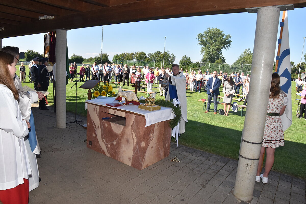 In einem kleinen Kirchenzug begleiteten die Vereinsabordnungen aus Göggelsbuch und Lampersdorf den Neupriester, der seinen mit der Krone versehenen Kelch trug, zusammen mit Pfarrer Peter Wenzel zum Festgottesdienst, wo sie sich im Spalier um den Altar mit den Ministranten aufreihten. Ein beeindruckendes Bild bot sich den Gläubigen auf dem Göggelsbucher Sportgelände, dort wo sonst Fußball gespielt wird.