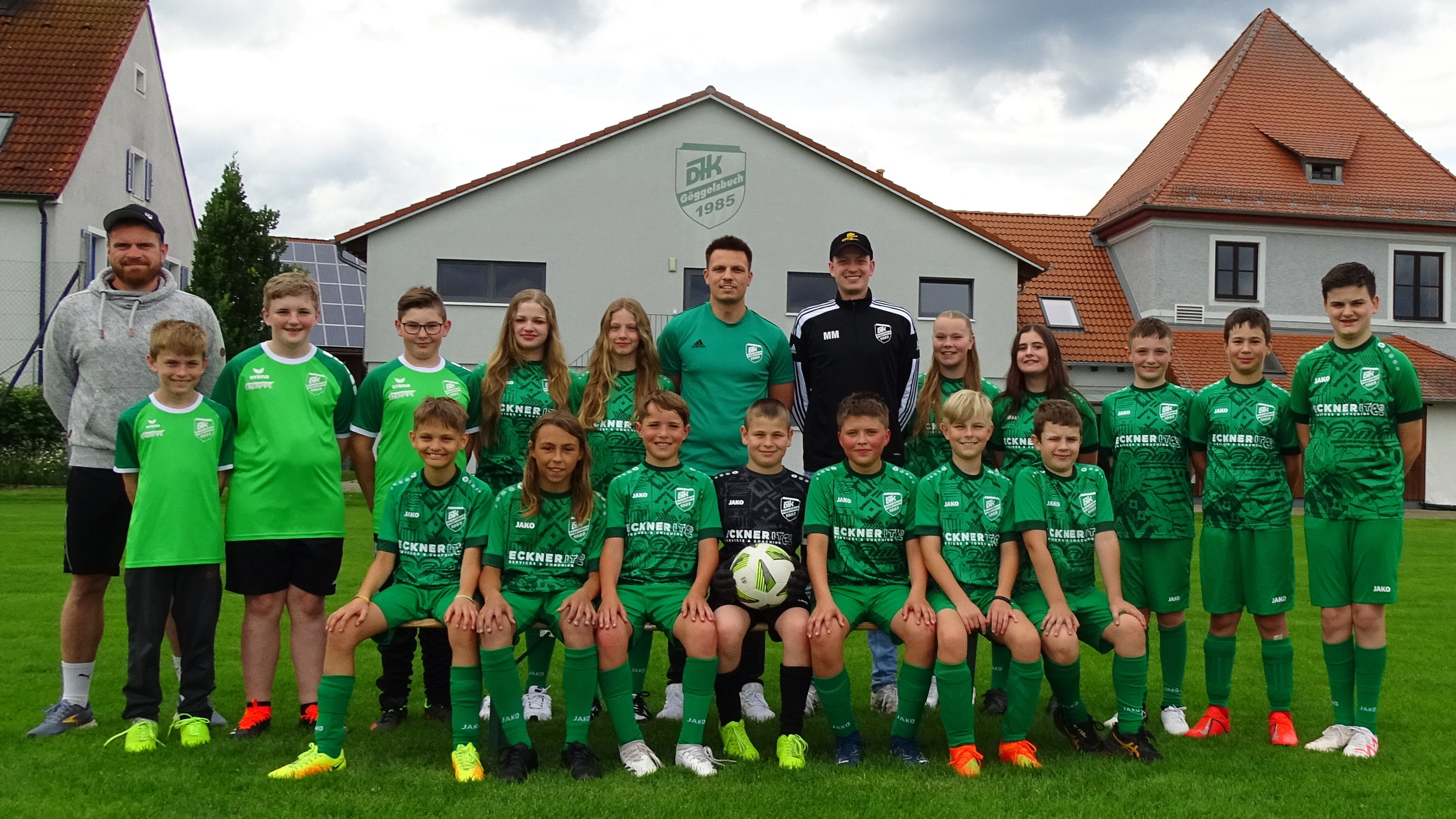Firmenchef Tobias Eckner (links) von der Firma Eckner IT Services & Coaching überbrachte der U13 der DJK Göggelsbuch einen Satz neue Trikots. Außerdem übernahm er mit seiner Firma auch noch die Kosten für die Abschlussfeier. Die beiden Trainer Lorenzo Latassa und Markus Mederer (hinten Mitte) bedankten sich im Namen der Mannschaft und des Vereins für die Großzügige Spende.
