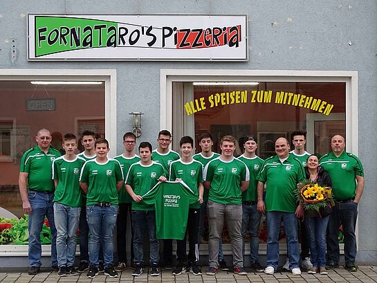 Damit man auch am ersten Tag bei der Mannschaftsvorstellung eine gute Figur macht, benötigte man noch ein einheitliches Shirt. Dies wurde von Fornataro‘s Pizzeria und Eisdiele aus Pyrbaum zur Verfügung gestellt.