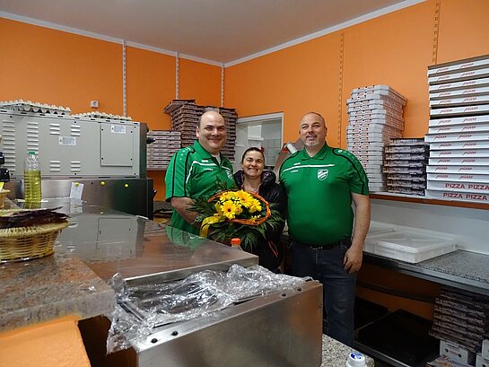 Auch hier bedankten sich die Trainer und die Mannschaft bei den beiden Besitzern der Pizzeria recht herzlich für die tolle Unterstützung. Natürlich gab es auch hier einen Blumenstrauß für die Chefin, der vom Trainer Antonio Latassa überreicht wurde.