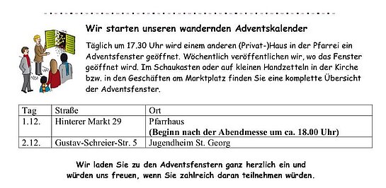 Die katholische Pfarrgemeinde Allersberg veranstaltet in diesem Jahr zum ersten Mal einen Adventskalender in Allersberg und den Ortsteilen.